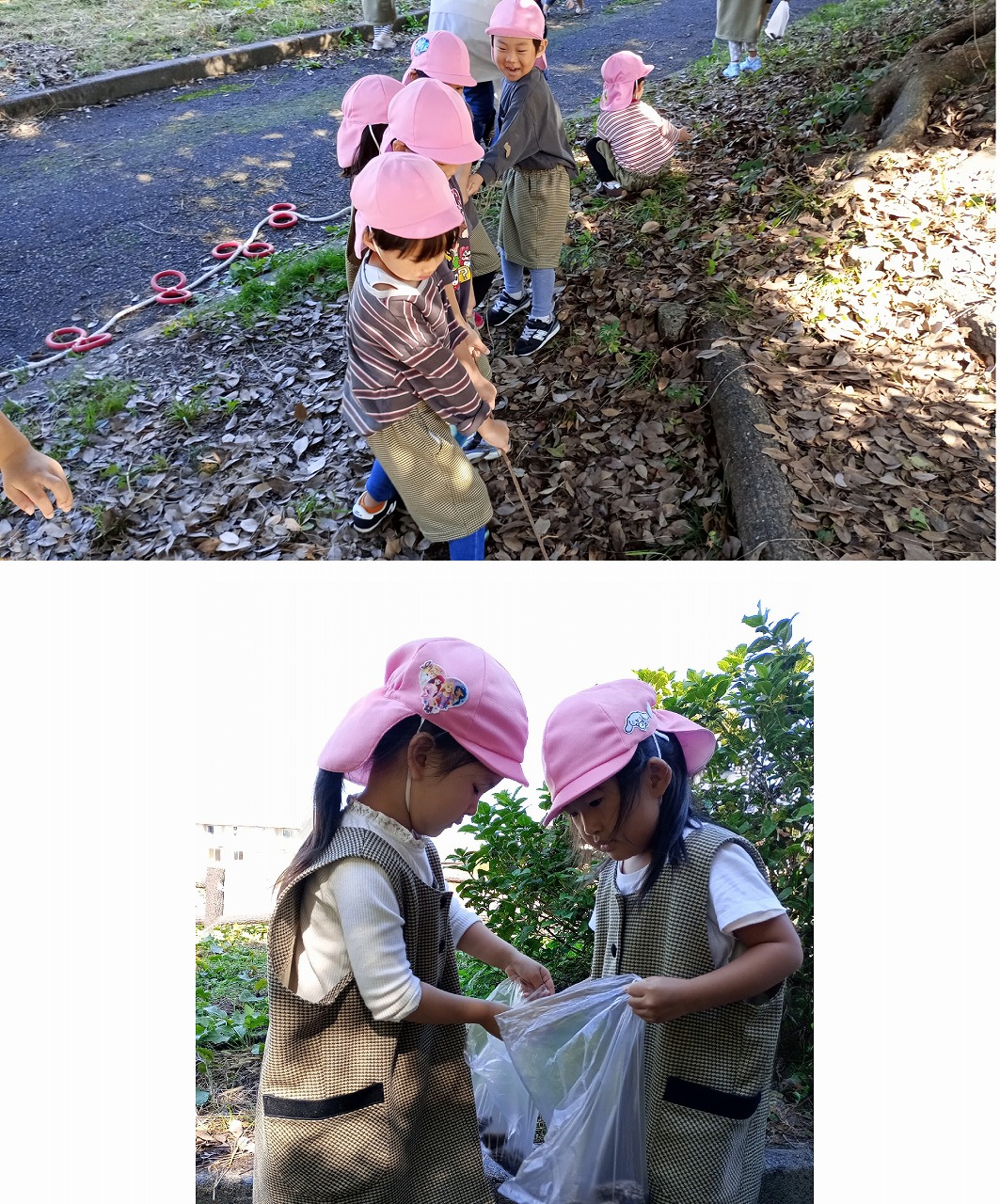南公園のお山へ行くと、葉っぱや木の実がたくさん落ちていました。「ドングリあったよ!」「葉っぱいっぱい拾ったよ」と目を輝かせながら袋いっぱいになるまで拾っていたお子さん達です。秋の自然が楽しい季節になりました。天気の良い日は、戸外へ出てたくさん遊びたいと思います。