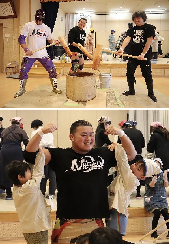 1月の初めにもちつき大会をおこないました。もちつきのゲストに新潟プロレスの鈴木敬喜選手、ビック・THE・良寛選手、渡辺大登選手をお招きして、一緒にもちつきをしたり、触れ合い会をしたりして楽しい時間を過ごしました。