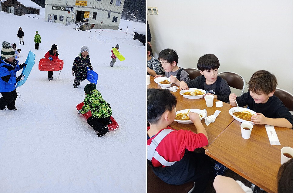 2月9日(月)三川温泉スキー場へそり滑りに行ってきました。そりに1人で乗ったり、2人で乗ったりしながら雪山から滑ると沢山の歓声が響いていました!!