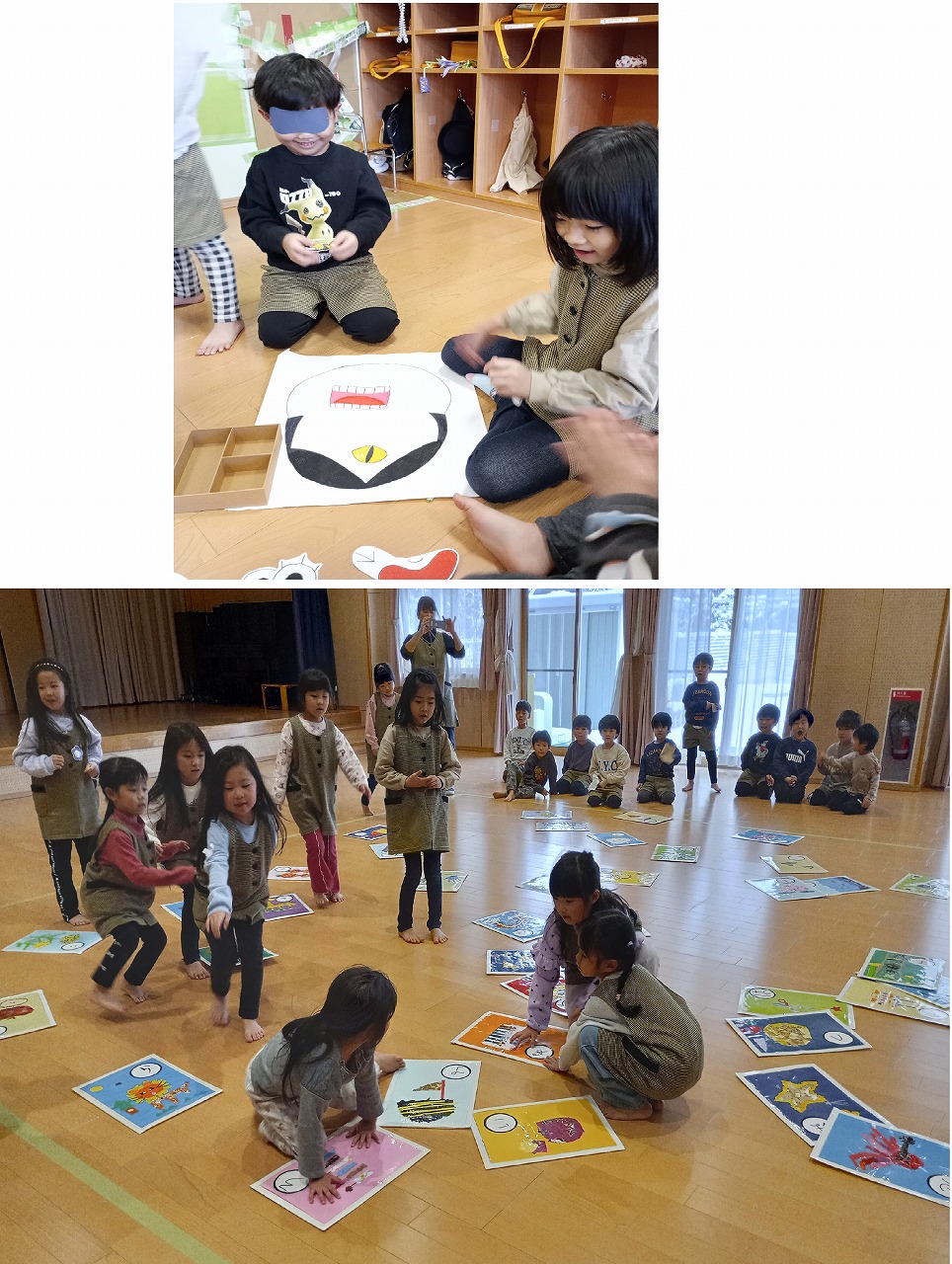 コマまわし、福笑いなどのお正月遊びを楽しんでいます。