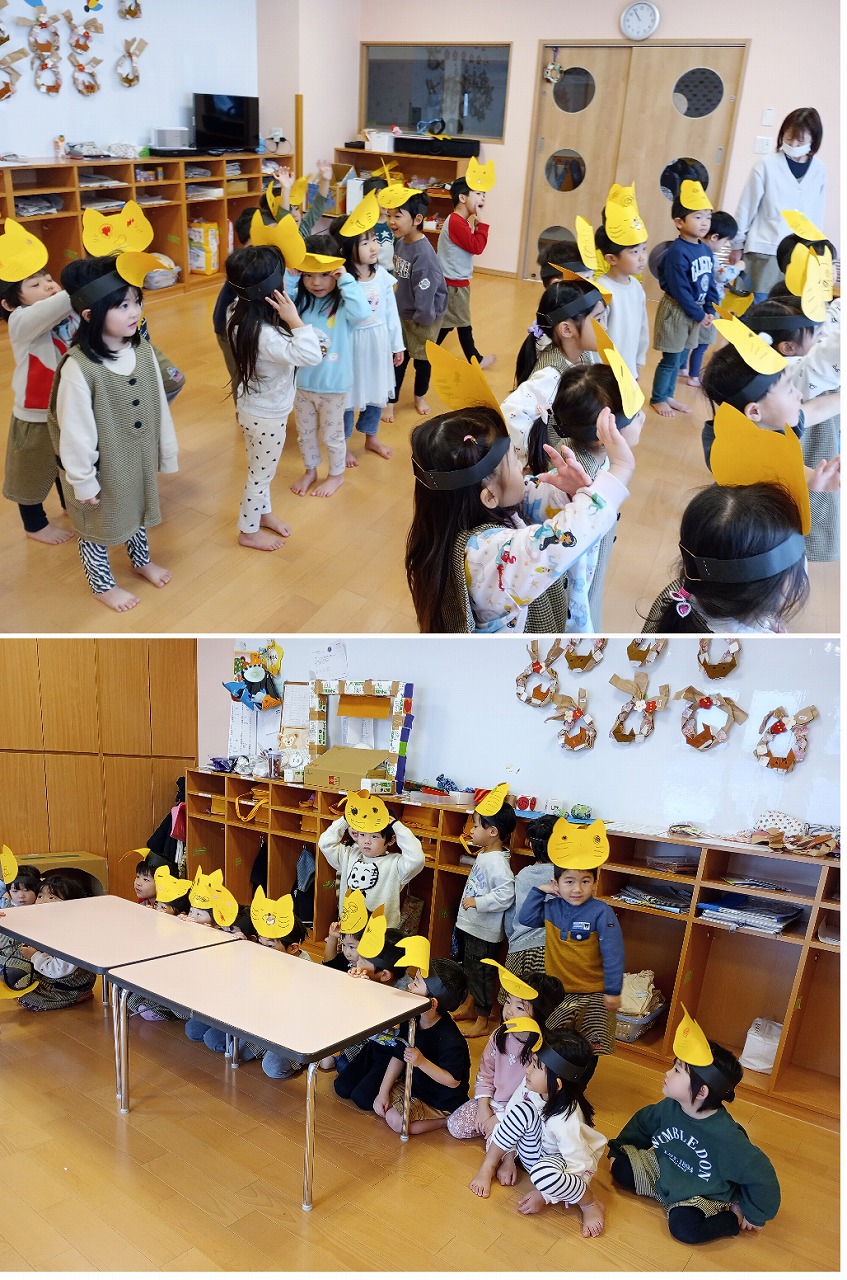 発表会に向けて、みんなが大好きなお話のひとつ「ノラネコぐんだん」の劇遊びをしてます。まだ、少し恥ずかしそうにする姿もありますが、振りやセリフを一緒に考えながら、親しみをもって楽しく発表できるよう練習していきたいと思います。