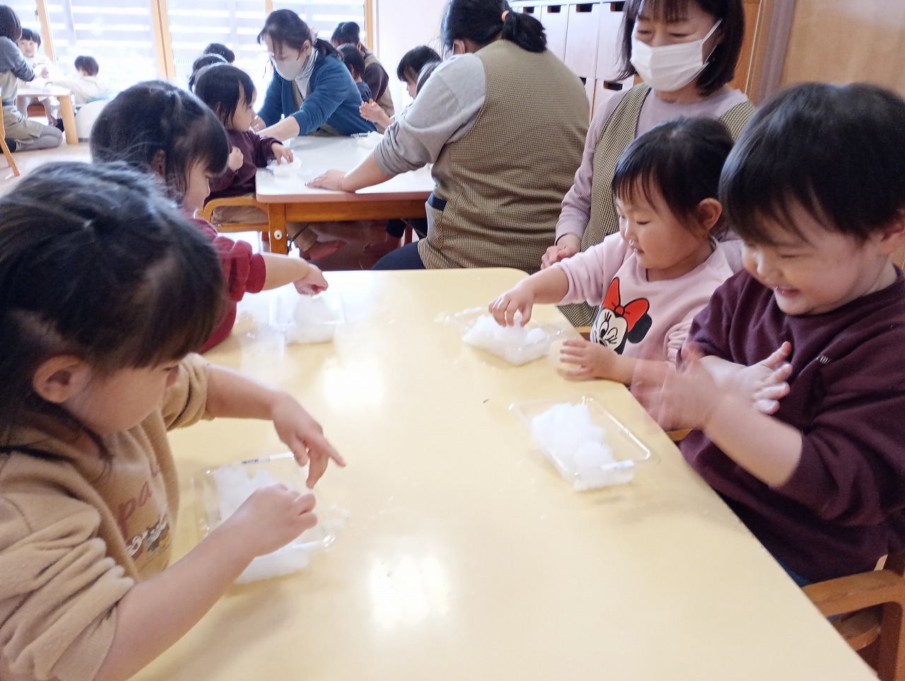 初めての雪遊びをしました。いちごパックに雪を入れ、手で触ると冷たさにびっくりしていました。少しずつ慣れると両手で握ってボールにしたり、テーブルの上で雪をつぶしたりと雪の感触を楽しみました。
