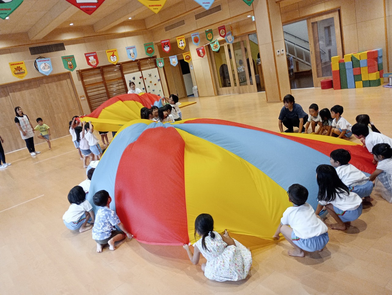 みんなで気持ちを合わせて楽しんで取り組んでいるバルーン!「ひっぱって!あーげーて!」と大きな声で掛け声をかけ、「風船」や「テント」など様々な技に挑戦しています。
